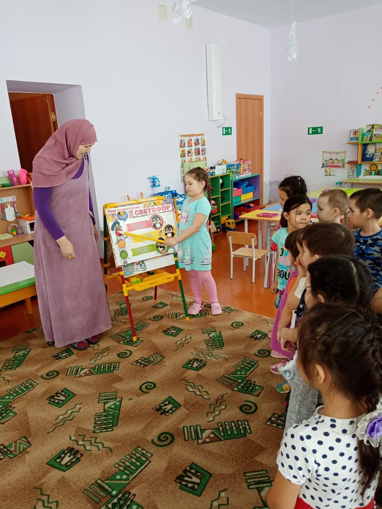 Әңгәмә барышында, балаларҙың, юл йөрөү ҡағиҙәләрен нисекбелеүҙәрен тикшерҙек, алған белемдәренә нығытыу яһаныҡ. Шулай уҡ юлдарҙа иғтибарлы булырға, юл ҡағиһәләренә бойһонорға кәрәклеген аңлаттыҡ. Ә эшмәкәрлек аҙағында балалар менән төҫлө ҡағыҙҙарҙан ҡорама эшләп йәбештерҙек, йәғни "машина" һәм "светофор" эшләнек.